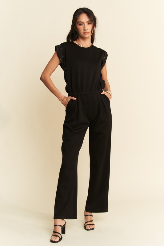 STONE DETAIL SLEEVES SOFT KNIT TRACK JUMPSUIT