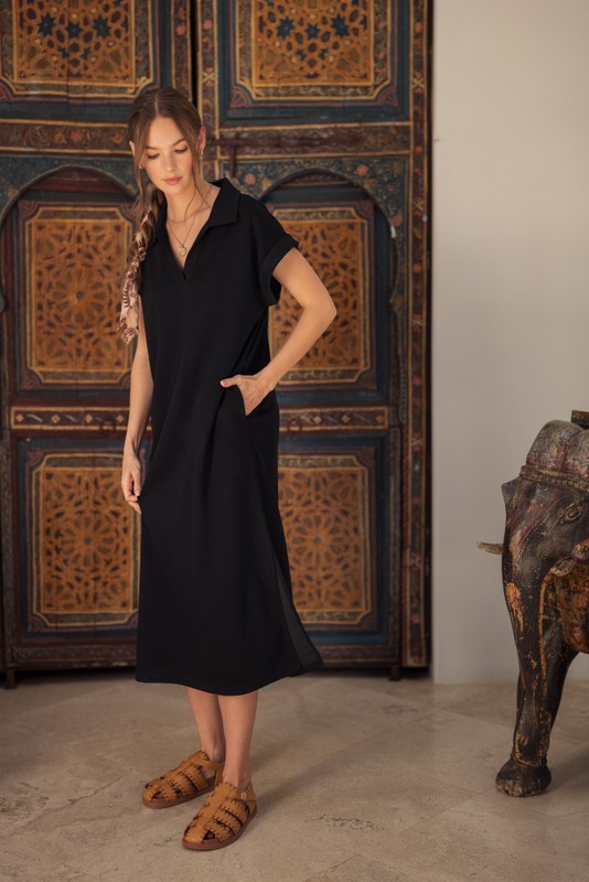 Solid midi dress with open collared neck, side pockets, short kimono sleeves, band cuffs, and side slit detail.